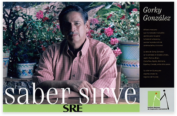 Fotografía en locación, de estudio y retrato para la campaña Saber Sirve, para folleto institucional IMEXCI, y para el catálogo de la exposición Trozos de Barro, homenaje a Gorky González. Secretaría de Relaciones Exteriores.